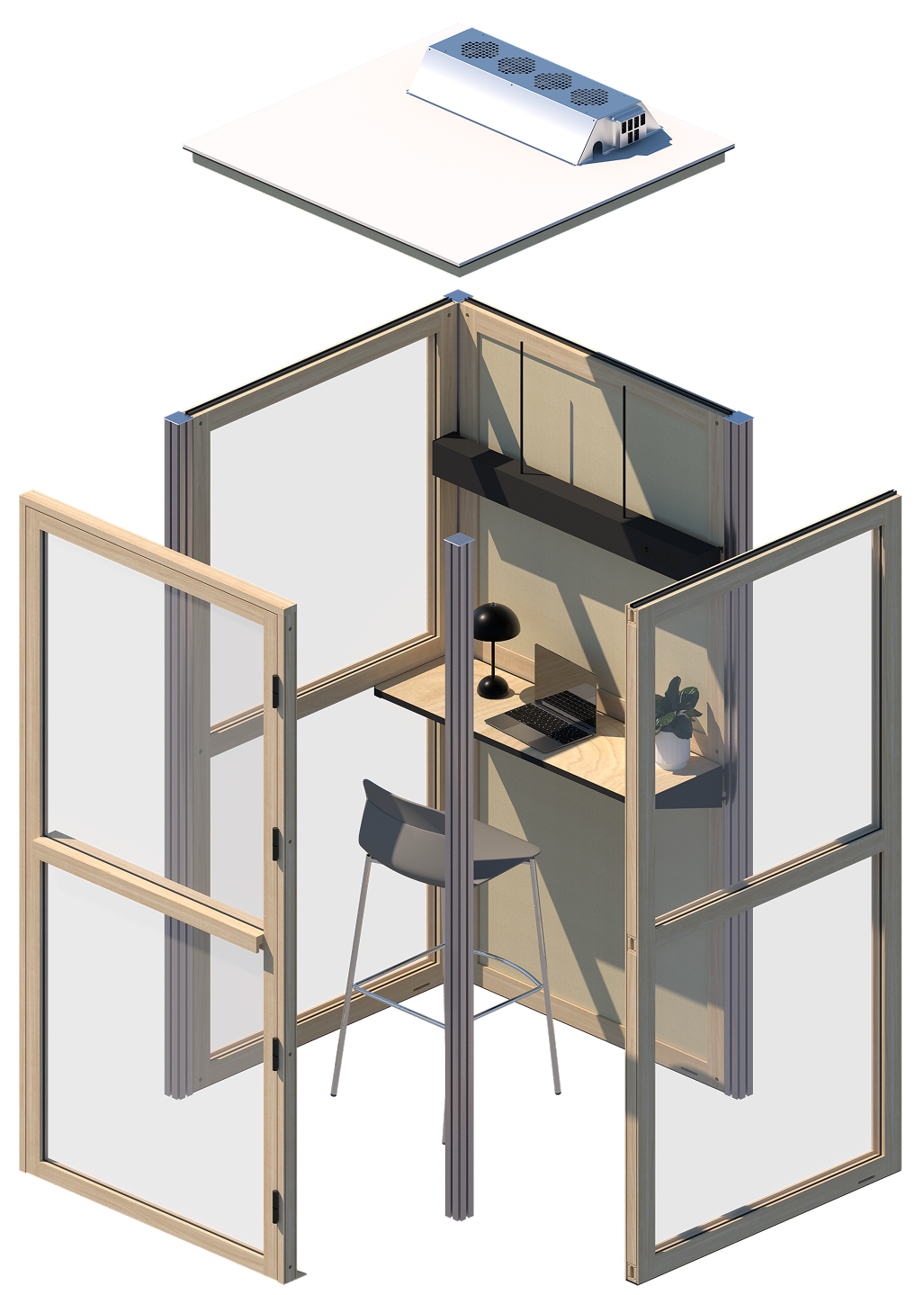 Espaces reconfigurables en 90 minutes, idéal pour salles de réunion, alcôves, micro-bureaux, zones silencieuses.